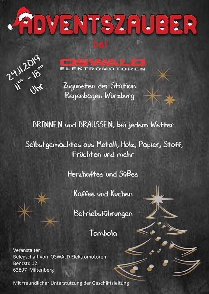 12.000 Euro Erlös werden der Würzburger „Station Regenbogen“ gespendet Am Sonntag vor dem ersten Advent luden die Mitarbeiter der Firma Oswald Elektromotoren zum zweiten Mal zu ihrem Adventszauber ein. Nach dem großen Zuspruch der ersten Veranstaltung wurde auch diesmal wieder ein Teil der Produktionshallen festlich geschmückt und für die Besucher am 24.11. geöffnet. Dort, wo […]